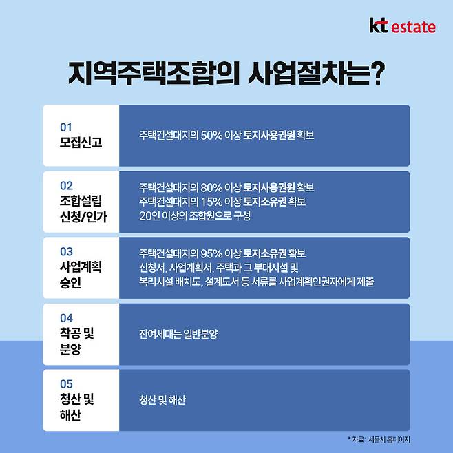 지역주택사업은 크게 조합원 모집, 조합설립인가, 사업계획승인, 착공 순으로 진행됩니다.