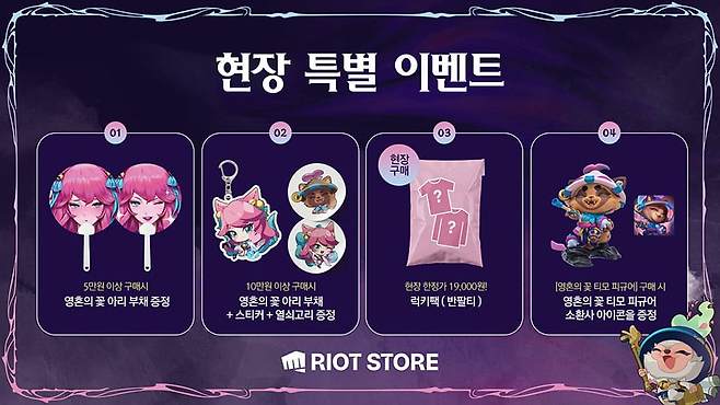 이 외에도 다양한 이벤트에 참여할 수 있다. 소셜 미디어에 팝업 현장을 인증하면 ▲포토이즘 부스에서 즉석 사진 촬영 후 팝업 현장에서만 제공하는 '아리의 온천' 프레임 등에 무료로 인화할 수 있으며 ▲티모의 티하우스에서는 음료를 즐길 수 있다. 팝업 내 라이엇 스토어에서는 구매 상품에 따라 '영혼의 꽃 아리 키링' 등 팝업 전용 혜택도 제공한다.