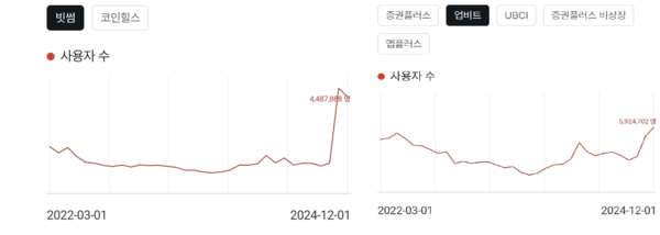 빗썸은 지난해 4분기 사용자가 급증하며 업비트를 바짝 추격한 만큼 현금흐름 격차가 더 벌어질 가능성도 제기된다. 두나무가 운영하는 비상장주식 거래 플랫폼 ‘비상장증권플러스’에 따르면 지난해 말 기준 빗썸 사용자 수는 448만7888명으로 10월1일의 127만8162명보다 250% 증가했다. 같은 기간 업비트 사용자 수가 415만5420명에서 592만4702명으로 34.6% 늘어난 것과 차이가 크다.
