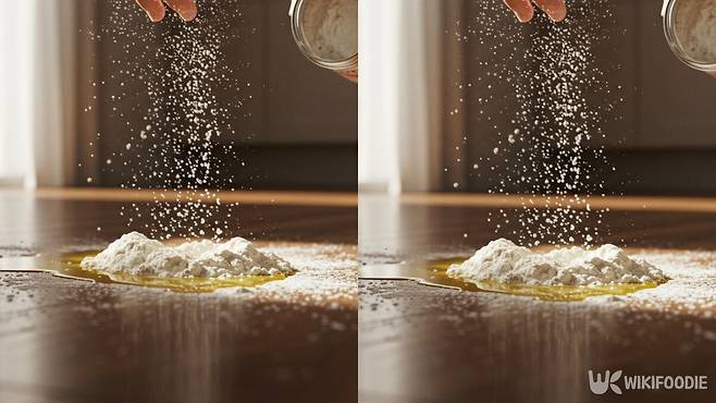 기름은 바닥에 떨어지는 순간 퍼지기 시작한다. 닦으려 하면 더 넓게 번진다. 이럴 때 밀가루를 뿌리면 기름을 흡수해 바닥에 눌어붙지 않게 막아준다. 이후 그대로 밀가루와 함께 걷어내면 정리가 수월하다.
