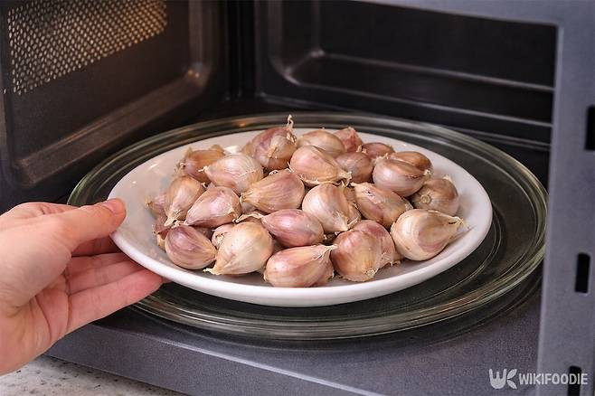 한두 쪽만 빠르게 써야 할 때는 전자레인지가 도움이 된다. 먼저 마늘 밑동의 단단한 부분을 살짝 잘라낸다. 그다음 접시에 올려 15~20초 정도만 가열한다.