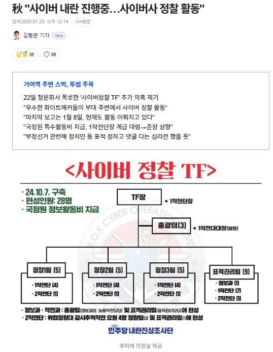 윤석열 정권의 '사이버 내란' 행태, 그 뿌리는 결국 이명박 국정원과 군 정보기관입니다. 여인형이 왜 인지전 전문가를 국정원과 군에 심고,'사이버 정찰 TF'를 준비했는지 주목해야 합니다. 최근 추미애 의원실에서 매우 중요한 폭로를 한 겁니다.
