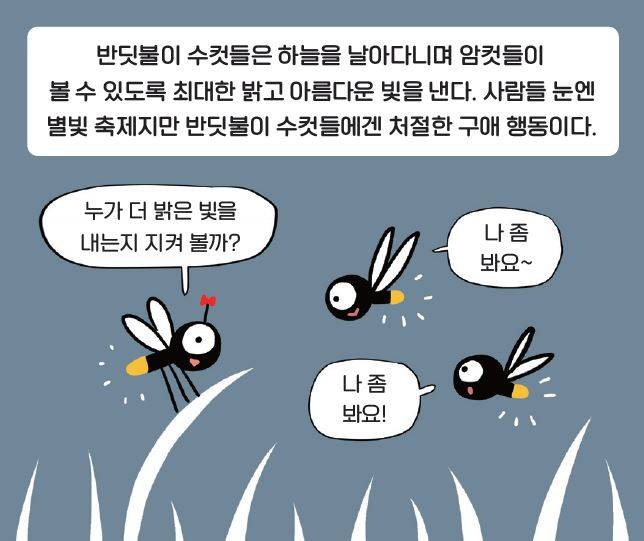 반딧불이 성충의 수명은 고작 2주에 불과하다. 그래서 미친 듯이 빛을 내지 않으면 번식에 실패한다. 암컷은 수컷의 불빛 신호를 보고 어느 수컷이 가장 질 높은 영양분을 가졌는지 판단한다. 수컷이 내는 빛의 밝기가 곧 건강을 상징하기 때문이다. 암컷은 건강한 알을 낳기 위해 풀숲에서 수컷이 내는 빛을 보고 있다가 힘 좀 쓰겠다 싶은 수컷이 나타나면 마찬가지로 짧게 빛을 내어 사랑의 답신을 보낸 후 오붓한 하룻밤을 보낸다.