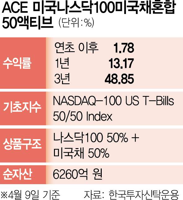 한국투자신탁운용이 2022년 8월 출시했고, 미국 대표 성장주 지수인 나스닥100과 미국채를 50대50 비중으로 혼합한 구조다. 같은 날 상장한 ‘ACE 미국S&P500미국채혼합50액티브 ETF’와 함께 대표적인 혼합형 상품으로 꼽힌다. 두 상품 모두 상장 당시에는 펀드 내 주식 비중이 30%에 그쳤지만, 지난해 9월 편입 비중 조정을 통해 50%까지 확대했다.