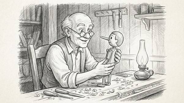책꽂이에서 삐져나온 동화책 표지가 눈에 들어왔다. 피노키오를 조각하는 제페토 할아버지. 그의 장난기 어린 눈빛과 마주쳤다.
