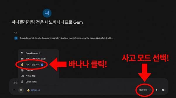 첫째, 제미나이 하단 메뉴에서 바나나 아이콘, '이미지 생성하기'를 클릭한다. 우측 하단의 '사고 모드'도 함께 선택한다.
