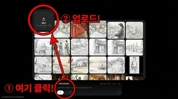 넷째, '프레임 동영상 변환'을 선택하면, 입력창 왼쪽 하단의 '+' 버튼을 누른다. 화면 중앙에 이미지 선택 패널이 뜬다. 왼쪽 상단의 '업로드'를 클릭하면, 내 컴퓨터에서 이미지 파일을 선택할 수 있다.