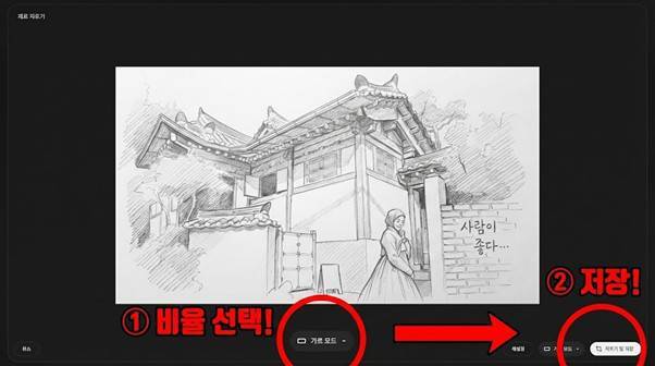 이미지를 선택하면, '재료 자르기' 화면이 나타난다. 가로 사진을 업로드했다면, 하단의 '가로 모드'를 선택하고, '자르기 및 저장' 버튼을 누른다.