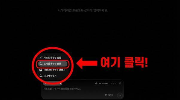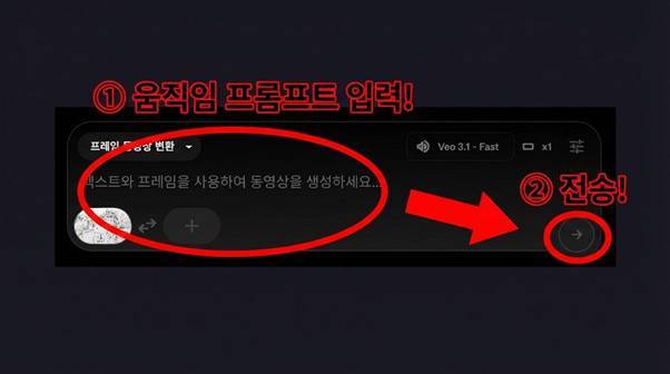 이미지가 등록되면 입력창 왼쪽에 썸네일이 보인다. 이제 '텍스트와 프레임을 사용하여 동영상을 생성하세요'라고 쓰인 곳에 동영상 프롬프트를 입력한다. 그리고 전송 버튼을 누른 후 기다리면, 동영상이 생성된다.