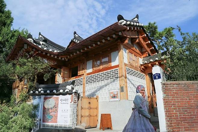북촌 한옥마을. 히잡을 쓴 외국인 여성이 수줍게 포즈를 취하고 있다.