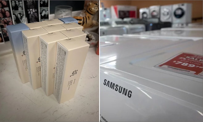 ▲ 트럼프 관세로 물가상승을 우려하는 미국 소비자들 사이에서 사재기 현상이 벌어지고 있다. 사진은 관세전 미리 구매한 한국 선크림(왼쪽)과 세탁기. [사진=SNS갈무리]
