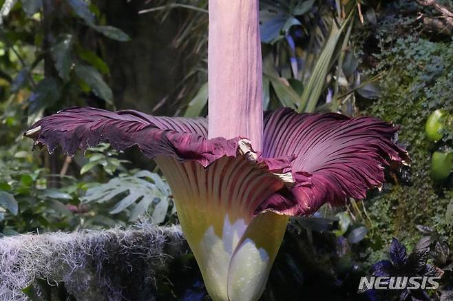 [샌프란시스코=AP/뉴시스] 28일(현지시각) 미 캘리포니아주 샌프란시스코의 캘리포니아 과학 아카데미 오셔 열대우림관에 시체꽃이 활짝 피어 있다. '아모르포팔루스 티타눔'(Amorphophallus Titanum)이라는 이름의 이 꽃은 시체가 썩는 듯한 악취가 나 '시체꽃'으로 불린다. 2024.02.28.