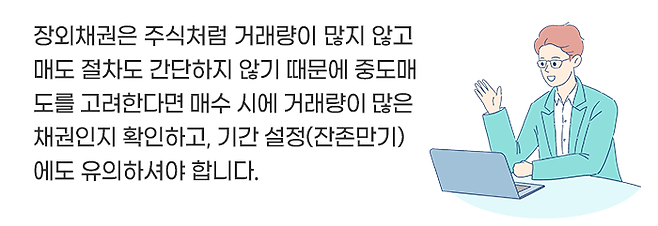 장내채권이면 주식처럼 장내에서 매도할 수 있지만(물론 매수자가 있을 경우), 장외채권인 경우에는 채권의 종류와 증권사에 따라 중도매도가 번거로울 수 있습니다. 따라서 장외채권 매수 시, 매도하는 방법도 알아두시면 좋은데요.
