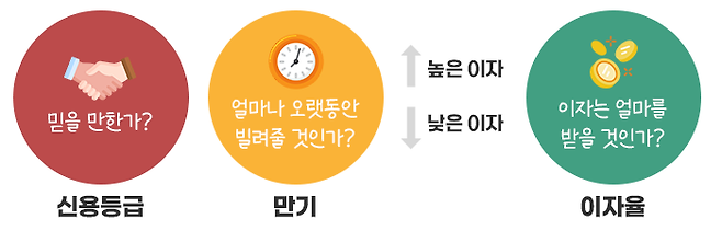 우리가 개인에게 돈을 빌려줄 때도 중요한 것은 빌려 가는 사람이 믿을 만한지, 얼마나 오랫동안 빌려줄 것인지, 그에 따라 이자는 얼마를 받을 것인지를 고려하게 됩니다.
