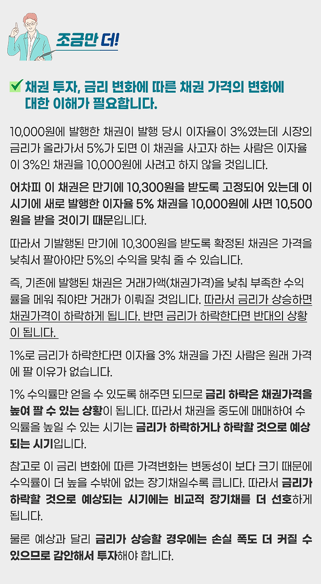 따라서 가급적 예금 대용(만기보유 목적)으로 활용하면서 중도매매는 시중의 채권금리 상황에 따라 신중하게 결정하셔야 합니다. 금리 움직임에 따라 금리가 상승했다면 손실, 금리가 하락했다면 이익이 발생할 것이기 때문입니다.