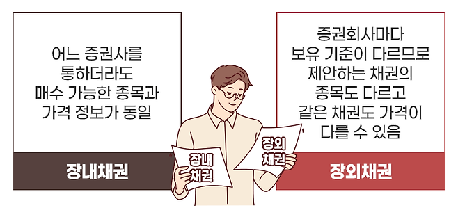 장외채권은 증권사에서 보유 중인 채권을 매매하는 것이므로 매매 절차는 간단하지만, 증권사마다 보유한 채권의 종목도 다르고 같은 채권도 가격이 다를 수 있습니다.