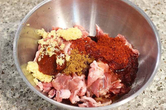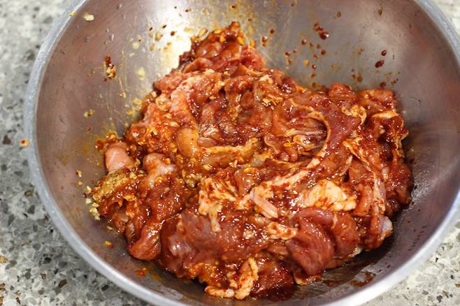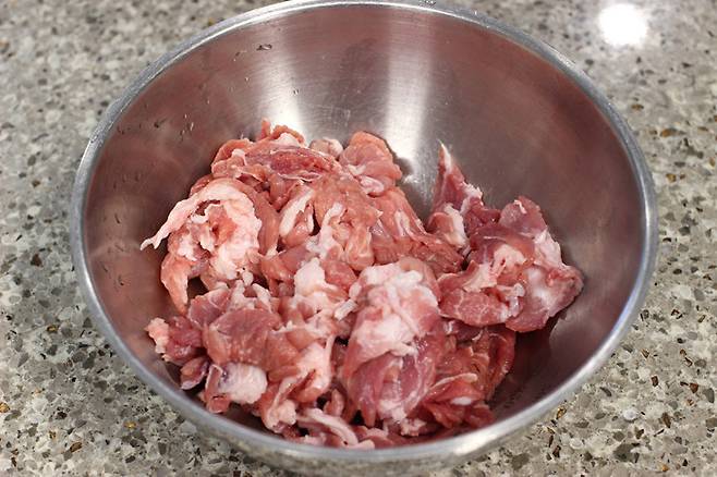 앞다리살을 구입할 땐 얇은 불고기감으로 사면 돼요. 너무 두꺼우면 양념이 잘 베어들지 않으니 얇게 썰린 것으로 골라야 양념이 잘 버무려져서 맛있답니다. 고기가 뭉텅이로 되어 있으면 한장씩 떼어내고 너무 큰 것은 가위로 숭덩숭덩 잘라요.