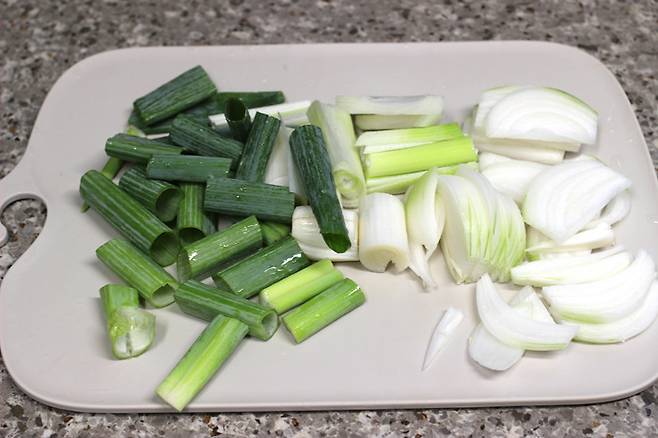 대파는 반으로 갈라 길게 썰고 양파도 총총 썰어요.