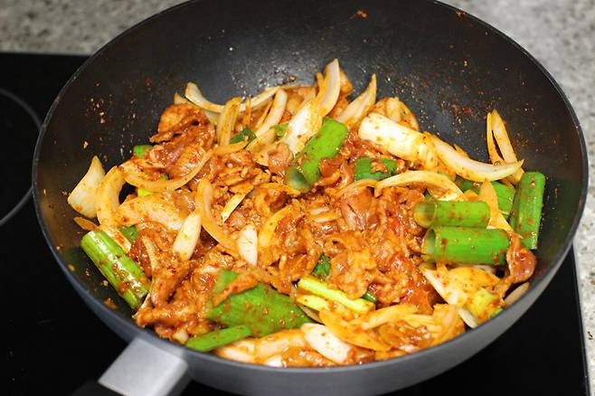 양파가 부드러워지고 고기가 다 익으면 불을 꺼요. 고기가 두껍지 않아서 익는데 오래 걸리지 않는답니다.