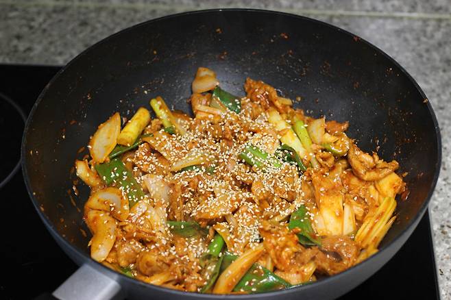 참기름과 통깨를 뿌려주면 맛있는 앞다리살 제육볶음 황금레시피가 완성 됩니다. 취향에 따라 깻잎쌈도 준비해보세요.