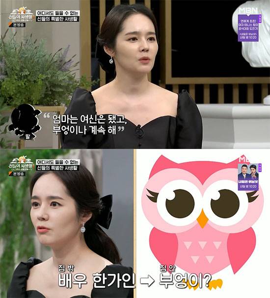 이에 한가인은 "제가 하고 싶지만, 나이 차이도 많이 나고"라면서 "딸한테 엄마는 무슨 역할을 할까 물었더니, '여신은 됐고 부엉이나 계속해'라고 하더라. 제가 부엉이를 닮았나보다. 아이들이 부엉이라고 한다. 대굴욕을 당하고 왔다"고 밝혀 눈길을 끌었다.