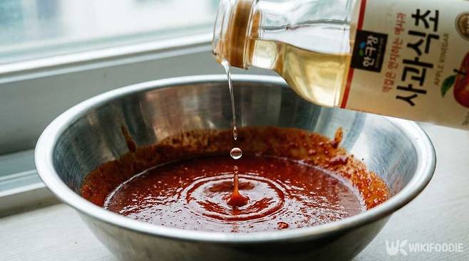 3. 식초 1/2큰술이 봄동 특유의 단맛을 살리고 느끼함을 잡아준다. 양념장에 반드시 넣는다.