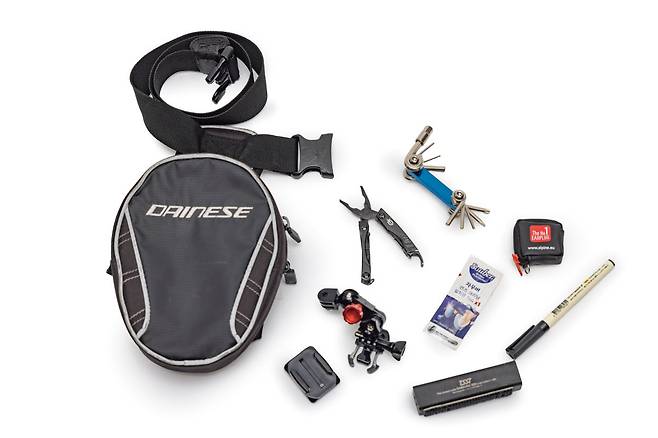 류석이 라이딩할 때면 항상 지참하고 다니는 작은 레그백 안에는 생각보다 다양한 제품들이 있었다. 가장 먼저 가방에서 나온 것은 공구였다. 정비에 일가견이 있는 걸 고스란히 드러내는 제품이다. 접이식 공구 안에는 6가지 크기의 육각키와 일자&십자 드라이버, 복스알까지 갖춰져있다. 경정비에 유용하게 사용하고 있다고 한다. 또 하나의 공구는 거버사의 다임 블랙 키체인 멀티툴이다. 칼, 가위, 줄, 드라이버, 플라이어 등 열가지 공구가 들어있는 소형 멀티툴이다. 간혹 까먹고 안 챙겨 나갔을 때 꼭 써야 하는 일이 생겨서, 잊지 않고 챙겨 다니고 있다고 한다.