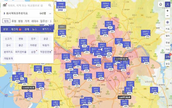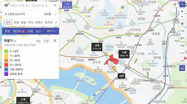 학원가 검색기능도 유용한데 주거용 부동산에서 학원가는 중요한 편의시설입니다. 잘 조성되어 있으면 플러스 요소가 됩니다. 대한민국 학군1번지 대치동에는 학원이 830개 모여 있습니다.