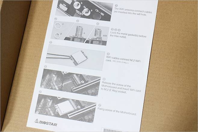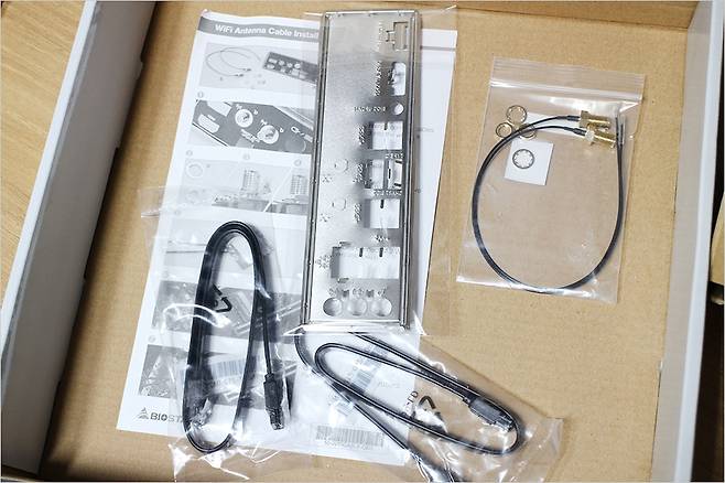 구성품으로는 메뉴얼과 함께 I/O 브라켓 쉴드, SATA 케이블, 와이파이 모듈 연결 부품이 들어있습니다. 와이파이 모듈이 있다면 해당 메뉴얼을 통해 쉽게 설치할 수 있습니다.