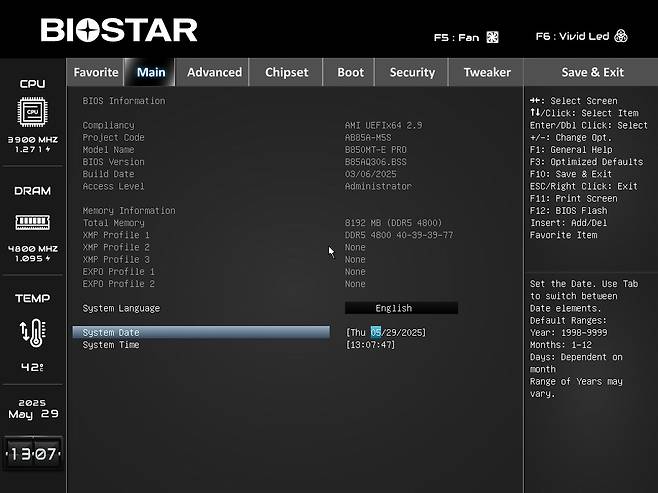 del 키로 바이오스에 진입하면 메인화면이 뜹니다. 간략한 설치 사양들을 확인할 수 있으며 아쉽게도 한글을 지원하지 않습니다. 현재 영어와 중문밖에 없습니다. F12는 펌웨어 업데이트 단축키, F11은 스크린 샷 키입니다.