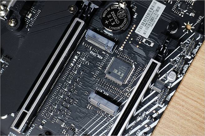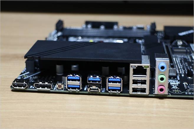 또 10페이즈 Dr.Mos 디지털 VRM 전원부가 탑재되어 높은 사양에도 보다 안정적으로 사용할 수 있는데요. 전원부에는 대형 알루미늄 방열판이 설치되어 있습니다. 후면 I/O 상단에 보호 커버로도 활용 됩니다. 기존 VRM 디자인에서 벗어난 Dr.Mos와 달리 단일 패키지로 통합이 되었다고 하며는데요. 원형 콘덴서 모양의 슈퍼 듀러블 캐패시터 및 인덕터 탑재로 수명과 에너지 손실을 최소화 합니다. 이는 전원부 바로 우측 나열 된 캐패시터를 통해 설계 확인이 가능합니다.
