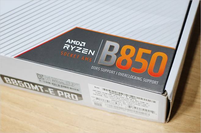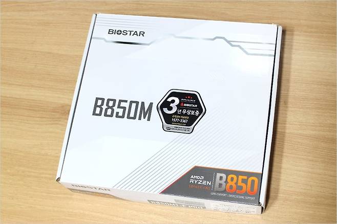 기본적으로 3년 무상 보증 스티커를 확인할 수 있고 화이트 컬러의 포장에 기본 특징을 확인할 수 있습니다. 기본 특징은 AMD B850 M-ATX 메인보드로 7000/8000/9000 라이젠 프로세서 지원 / 고성능 10페이즈 Dr.Mos 전원부 / 더 넓어진 쿨러 / PCie 5.0 지원 등이 있습니다.