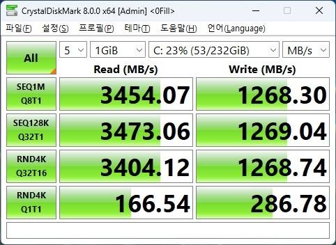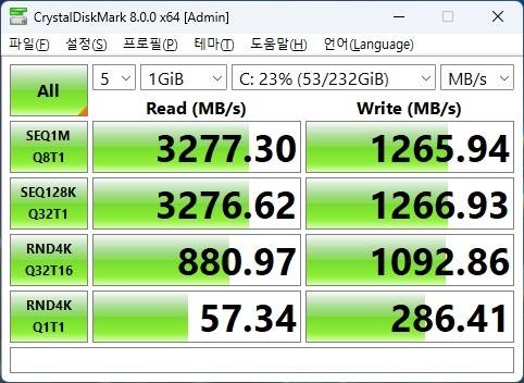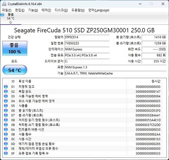 정상적인 속도 확인과 함께 아이들 45도 풀로드시 54도라는 안정적인 온도 효율을 보여주었습니다. 따로 추가 방열판 가드 필요 없이 메인보드에 제공되는 기본 가드로 높은 쿨링 효과를 기대할 수 있습니다.