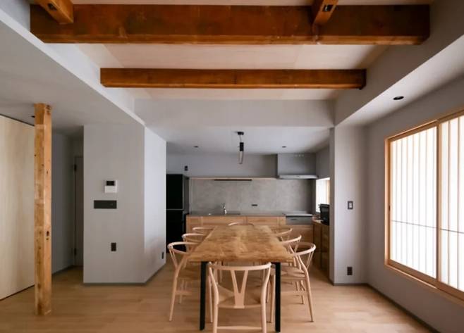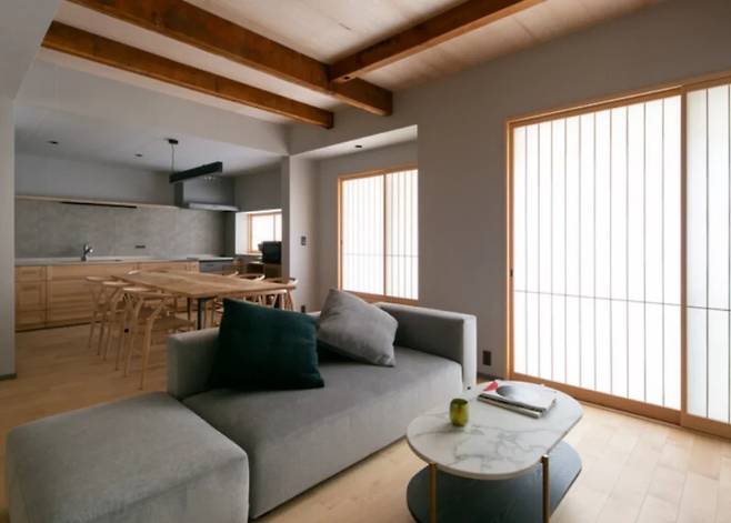 기존의 일본식 방은 거실, 다이닝룸, 주방 공간과 연결되어 하나의 연속적인 공간을 형성하며, 무광 타일 벽과 간접 조명을 통해 일체감을 부여했습니다.