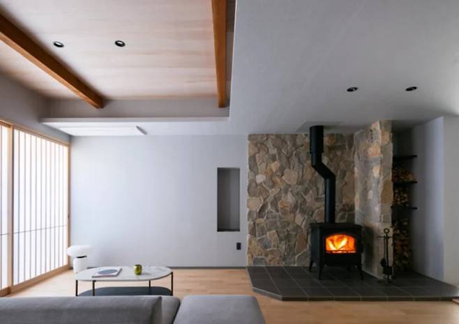 이 공간의 가장 눈에 띄는 특징은 일본 고유의 재료와 빛의 조화를 현대적으로 재해석한 디자인입니다. 벽과 천장은 빈초탄 숯 성분이 포함된 토사 와시 종이로 마감되어 부드러운 회색 톤을 만들어냅니다. 바닥은 자작나무 판자를 사용했으며, 내부 마감재는 옅은 색의 시나 합판을 사용해 일관된 느낌을 줍니다.