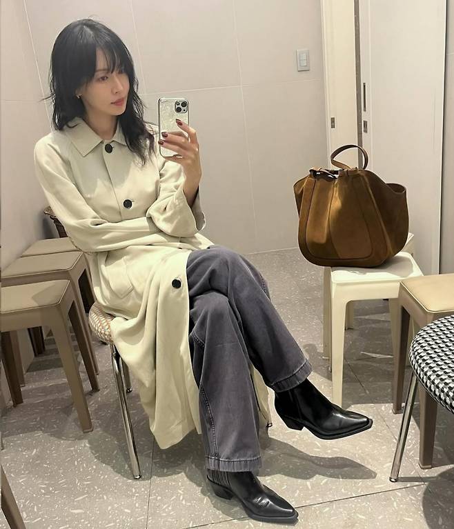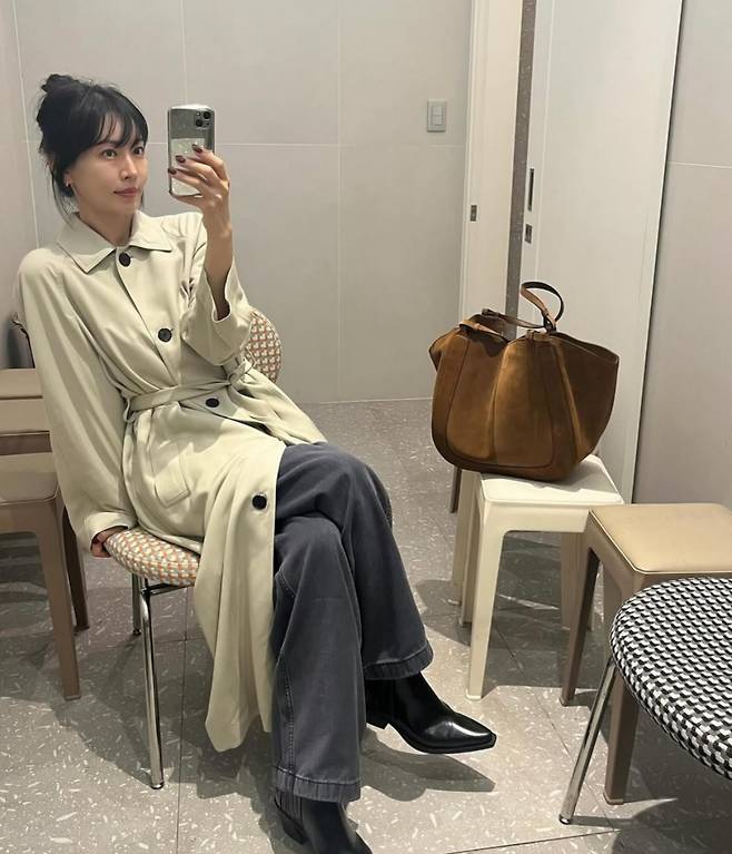 라이트 베이지 톤의 트렌치코트는 군더더기 없는 디자인과 벨트 디테일로 단정한 실루엣을 완성했고, 여기에 차콜 그레이 팬츠를 매치해 무게감을 더했는데요.