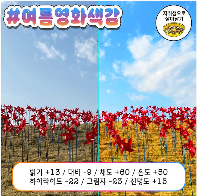 온도 ↓, 채도 ↑, 하이라이트 ↓