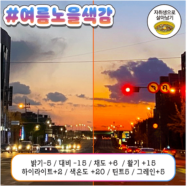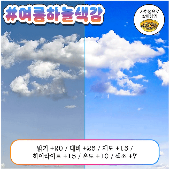 온도 ↓, 채도 ↑, 하이라이트 ↓