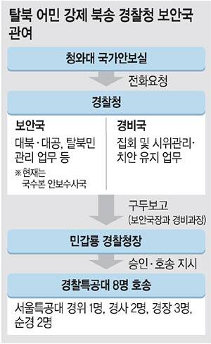 25일 김용판 국민의힘 의원실이 입수한 경찰청 자료에 따르면 당시 경찰청 A 보안국장(현재의 경찰청 국가수사본부 안보수사국장 직책) 및 B 경비과장은 민 전 청장에게 경찰특공대 지원과 관련해 구두 보고한 것으로 파악됐다. 청와대 국가안보실은 경찰청에 전화로 경찰특공대 투입을 요청했고, 이후 민 전 청장의 승인을 받아 투입이 결정됐다고 한다. 당시 민 전 청장에 대한 국가안보실의 호송임무 요청 보고 자리에는 경비국장이 해외 출장 중이어서 B 경비과장이 직무를 대신했다. 경찰청 보안국은 대북·대공 및 탈북민 관리 업무를, 경비국은 집회·시위 관리 및 치안 유지 업무를 총괄하고 있다. 사실상 경찰이 탈북 어민 강제 북송 과정에 관여한 정황이 드러난 셈이다.
