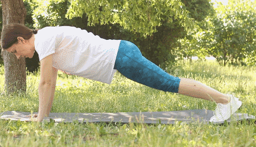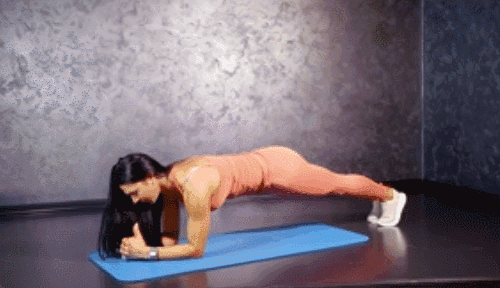 플랭크 자세로 시작합니다. 오른쪽 무릎을 왼쪽 팔꿈치 방향으로 크로스하여 당겼다가 원위치합니다. 왼쪽 무릎도 오른쪽 팔꿈치 방향으로 교차하여 당긴 뒤 다시 되돌립니다.