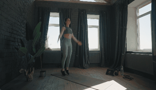 바닥에 똑바로 서서 두 발을 모은 상태로 시작합니다. 점프하며 다리를 어깨너비 이상으로 벌리고, 팔은 머리 위로 들어 손바닥을 마주칩니다. 다시 점프하면서 팔을 내리고 다리를 모아 원래 자세로 돌아옵니다.