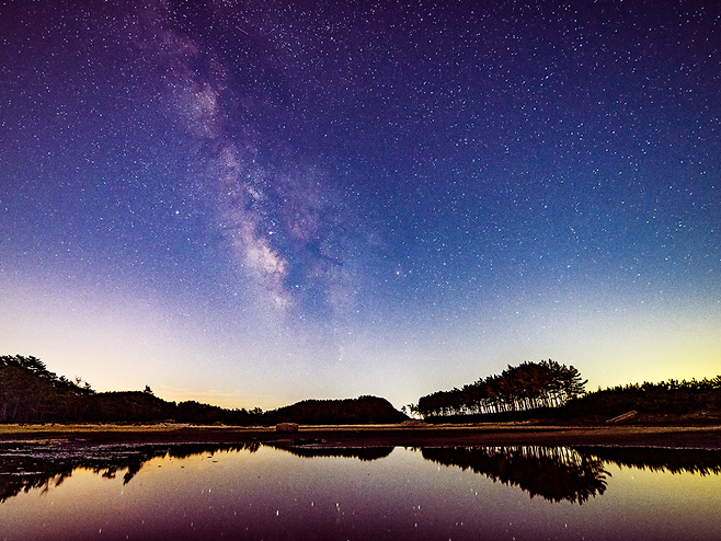 운여해변은 서해에서 근사한 은하수를 볼 수 있는 몇 안 되는 곳 중 하나입니다. 서해에서 가장 큰 섬인 안면도 남쪽에 위치합니다. 밀물 때면 밀려든 바닷물이 백사장 안쪽에 자그마한 호수를 만들어내는데, 여기에 별과 소나무가 비쳐 황홀한 풍경을 만듭니다. 서해답게 국내에서 가장 늦게까지 은하수를 볼 수 있는 곳으로, 운여해변의 솔섬 위로 수직으로 서 있는 은하수가 독특합니다.