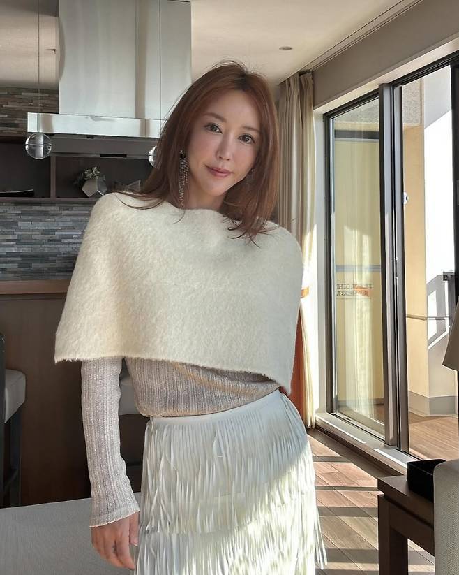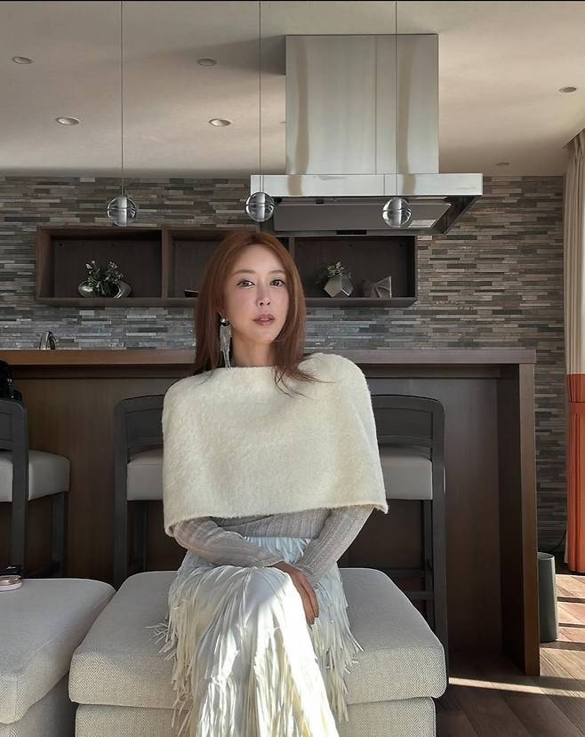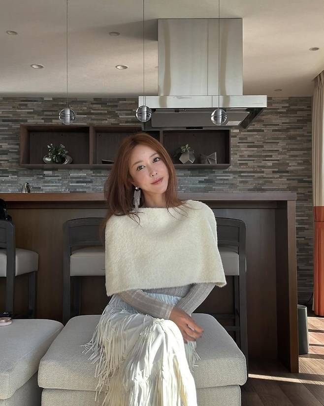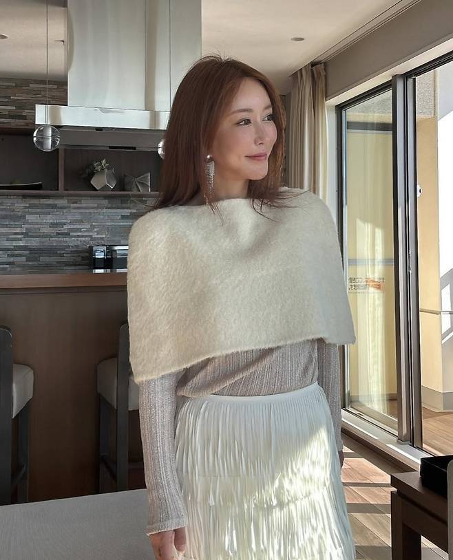 특히, 포근한 텍스처의 크롭 니트 숄과 은은한 광택이 감도는 니트 상의가 어우러지며 부드러운 여성미를 자아냈습니다.