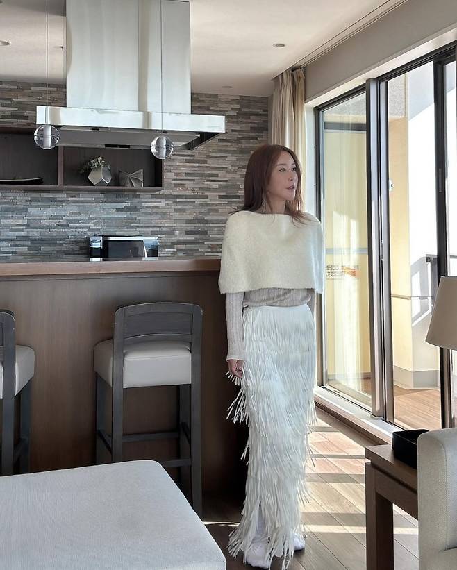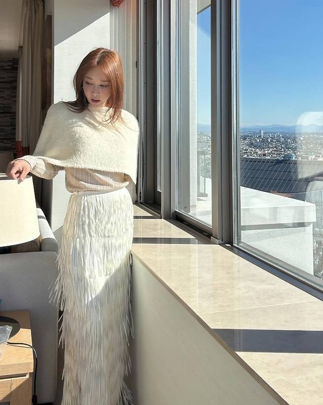 여기에 슈는 유니크한 디자인의 프린지 롱스커트를 매치해 클래식하면서도 트렌디한 무드를 완성했습니다.