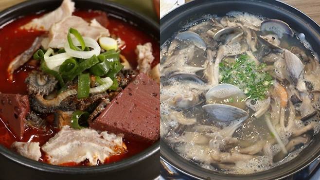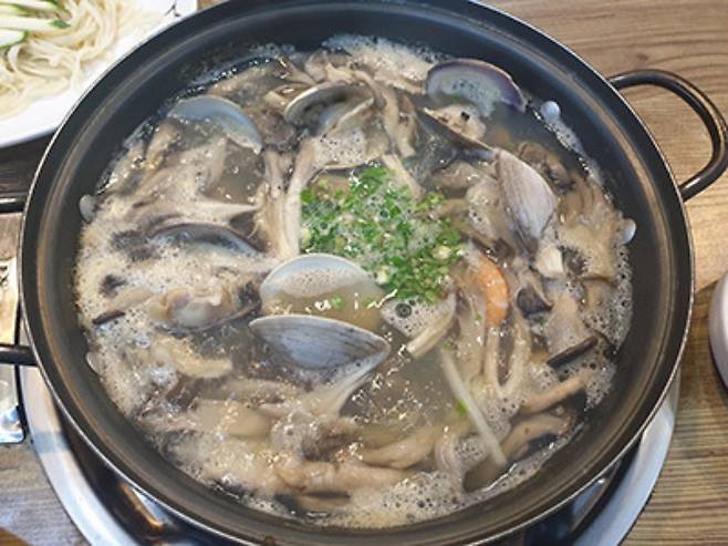 이를 다 먹을 때쯤 칼국수 면발을 넣는데, 부드러우면서도 탱글탱글한 식감의 통통한 면은 국물과 잘 어울린다. 잔뜩 들어간 조개와 버섯으로 우려낸 국물은 맑고 시원하면서도 깊어 해장용으로도 완벽한 맛을 자랑한다.