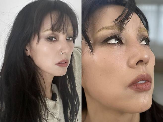 공개된 사진 속 이효리는 파격 메이크업을 하고 다채로운 표정을 짓고 있다. 스모키한 눈화장과 노란 눈썹이 시선을 사로잡는다.