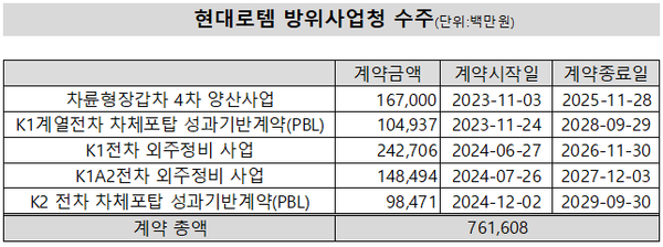 방사청과 맻은 5건의 전차 양산 및 정비(PBL) 계약이 진행중이다. 사업 및 계약금액은 △차륜형장갑차 4차 양산 △K1계열전차 차체포탑 성과기반계약(PBL) △K1전차 외주정비 사업 △K1A2전차 외주정비 사업 △K2전차 차체포탑 성과기반계약(PBL) 등이다. 국군이 사용할 K2전차 4차 양산도 연내 발주될 예정이다.