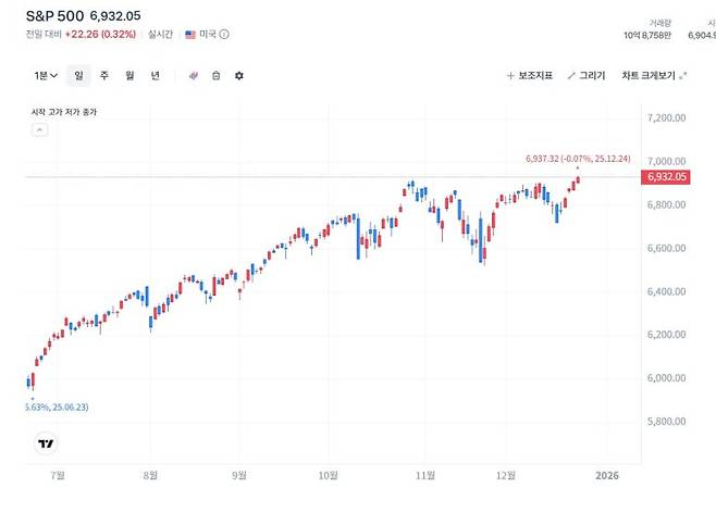 2025년 1월 2일 약 5,868포인트로 시작했던 S&P 500 지수는 12월 26일(현지시간 24일 종가 기준) 6,932포인트를 기록하며 사상 최고치를 경신했습니다. 연초 대비 무려 18.1% 상승했습니다.
