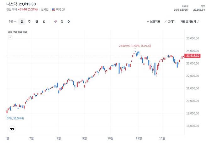같은 시기 기준 나스닥 지수 역시 19,281포인트에서 시작해 12월 26일 23,613포인트까지 치솟았습니다. AI 반도체 붐을 타고 연초 대비 약 22.5% 급등하며 기술주 전성시대를 이어갔습니다.