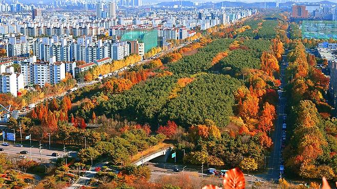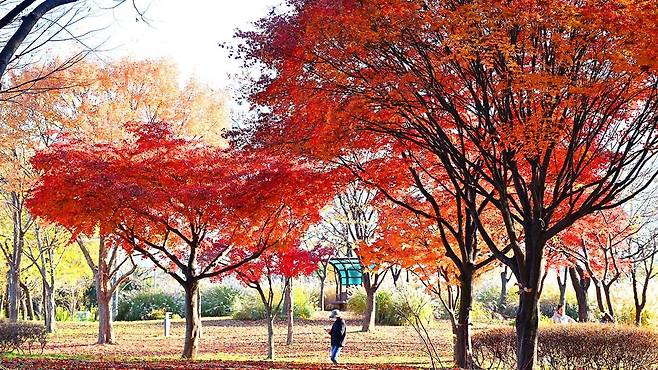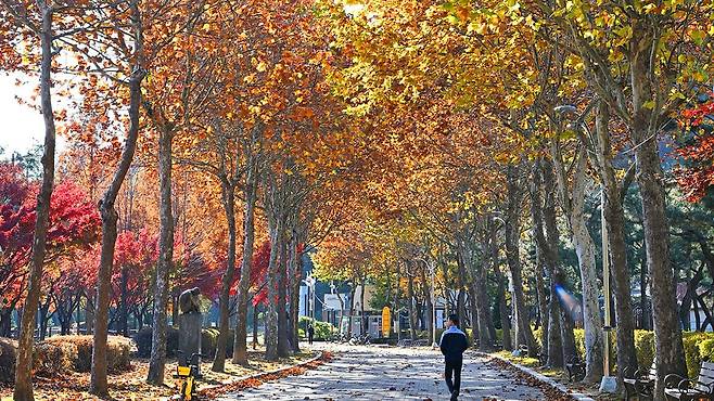보통의 단풍 명소가 11월 초면 절정을 지나지만, 옥구공원은 11월 중순 이후까지도 단풍이 깊게 물드는 드문 장소입니다. 초입부터 이어지는 은행나무와 단풍나무 군락은 노란빛과 붉은빛이 어우러지며 풍성한 가을 색을 자아냅니다.
